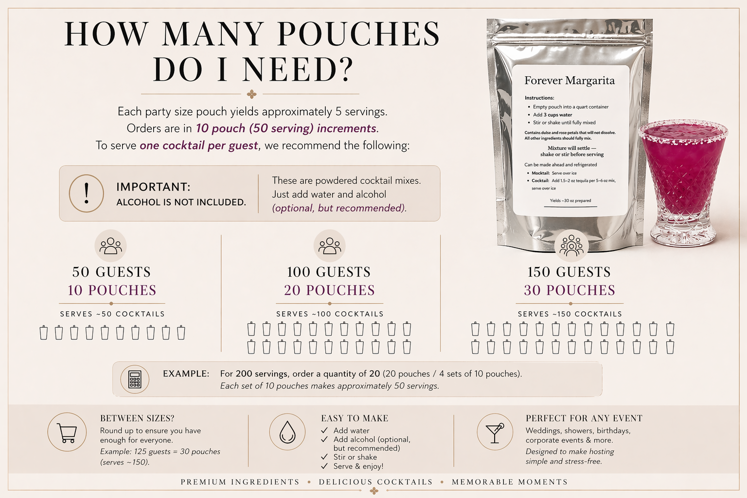 Each party size pouch yields approximately 5 servings—perfect for serving a signature cocktail at your event.